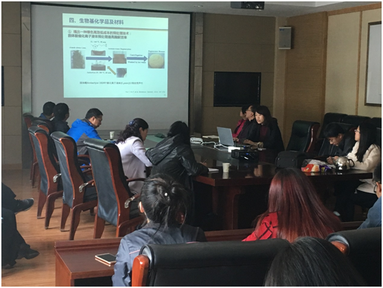 陈院长首先对许凤教授和张学铭教授的到来表示热烈欢迎。许教授从农林生物质的发展现状及目前的研究瓶颈出发,介绍了生物质细胞壁天然抗降解屏障的形成机理,并率先提出了细胞壁主要组分清洁高效分离、结构鉴定的新理论和新方法。通过对主要组分进行定向功能改性,实现了三大素的高值化利用,成功制备出功能性气凝胶、水凝胶、酚醛树脂胶、平台化合物等。这些成果应用在制浆造纸、木材工业和化工制品行业中,产生了巨大的经济和社会效益。最后,许教授与参会的老师和同学进行了深入交流。