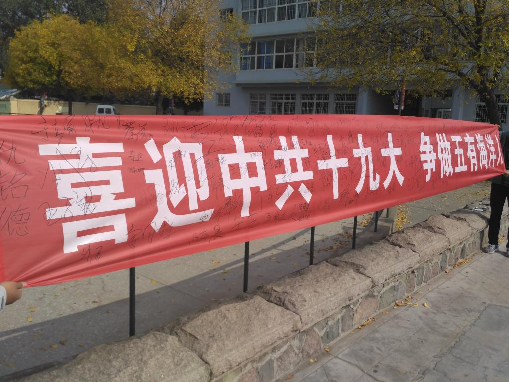 10月21日,海洋学院学生会在小五四北举办横幅签字活动,旨在通过签字活动加强学生争做最美海洋人思想意识。活动伊始,同学们纷纷在“喜迎中共十九大,争做五有海洋人“的横幅前驻足、关注并签下自己的名字。签名活动仅持续了一个小时,但横幅上已经签满了同学们的名字,大家用实际行动响应号召,以实际行动表明认真学习党的十九大精神。