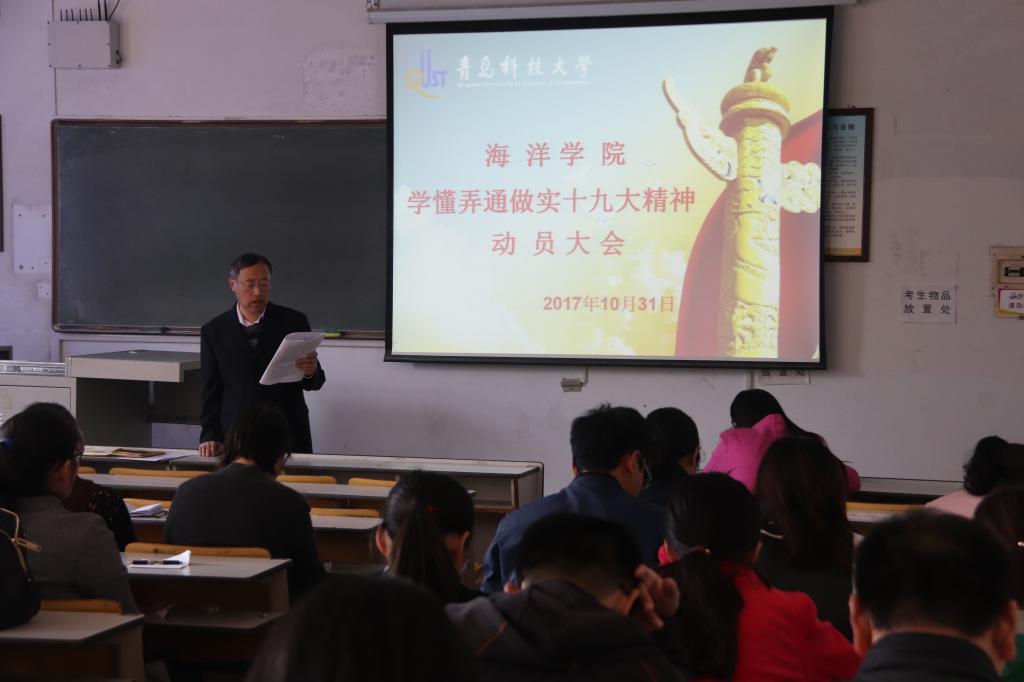 10月31日下午1:30,海洋学院于一教307召开学懂弄通做实十九大精神动员大会,传达学习中国共产党第十九次全国代表大会精神,对海洋学院学习宣贯落实作出全面安排部署。海洋学院党总支书记刘同刚主持会议、传达williamhill中国十九大精神部署会要求并作动员讲话。海洋学院全体领导班子及全员教职工参加了此次会议。