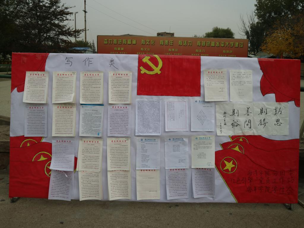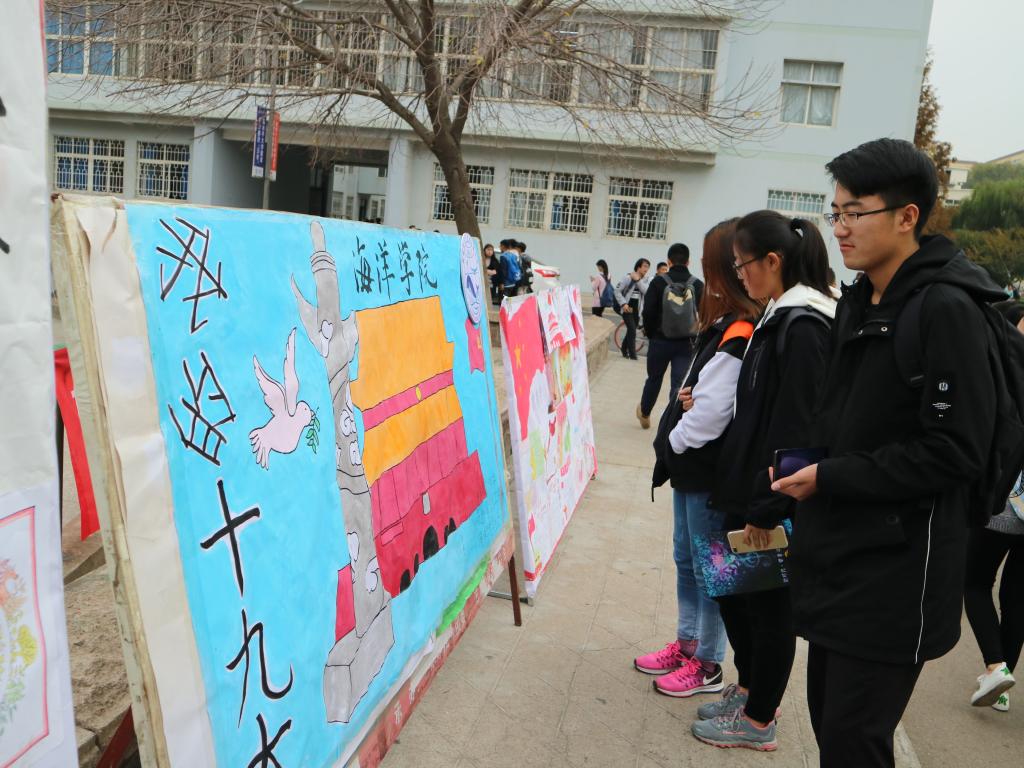 海洋学院党员工作站结合工作实际,将十九大报告全文形成精炼的学习资料,组织全院学生进行学习。学生党员充分发挥带头作用,带领全院学生将自己的所学所感以丰富多样的形式展示出来,参与度高达90%。学习成果展示活动共收到作品271件,其中写作类作品195篇,原创诗歌19篇,板报类作品36幅,书法10幅,绘画11幅。作品形式丰富多彩,内容思想真实深刻,一幅“数风流人物,还看今朝”的书法作品苍劲有力,展示了海洋学子蓬勃向上,激流勇进的时代精神;一幅“不忘初心、牢记使命”的剪纸艺术栩栩如生,凝结了学生党员不负重托,一往无前的坚定信念;一首“你好,新时代”的原创诗歌气势恢宏,表达了新时代青年心系祖国,心有大我的家国情怀;“山海情”支教服务团队的摄影作品,新颖独到,展现了志愿者们无私奉献,勇于担当的服务精神;“心向十九大”、“共筑中国梦”等手绘板报线条柔和、色彩饱满,抒发了莘莘学子对祖国的大好河山、大美风景的无限热爱。经评委组评选,共选出李慧敏、陈怡乐、闫煦等同学的五十余幅优秀作品进行展出。展出伊始,同学们纷纷在展板前驻足、观看、热议,学习气氛浓厚,大家用实际行动响应党的号召,积极学习并践行十九大精神。