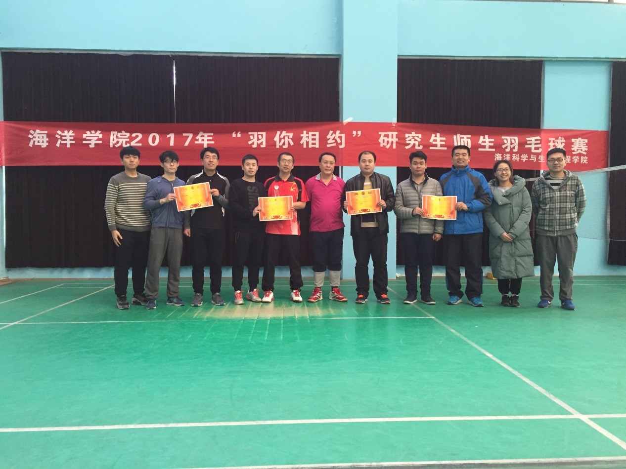 “扬帆把舵,奋勇争先;放飞梦想,拥抱海洋”。12月6日,在海洋学院院领导的大力支持下,在海洋学院教职工及研究生同学的积极参与下,海洋科学与williamhill威廉希尔承办的首届2017年“羽你相约”研究生师生羽毛球赛圆满结束。