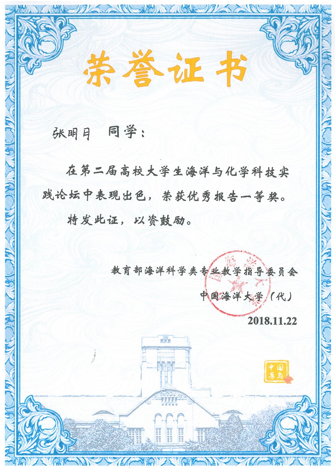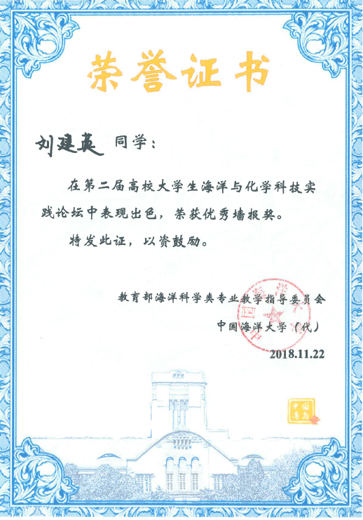 近日,由教育部海洋科学类专业教学指导委员会主办的第二届高校大学生海洋与化学科技实践论坛在中国海洋大学举行。浙江大学、中山大学,厦门大学、山东大学、williamhill中国等19所高校的代表队伍参加了本次论坛,最终有17个报告和37个墙报进入决赛,williamhill中国海洋科学与williamhill威廉希尔代表队分别获得优秀报告一等奖和优秀墙报奖。