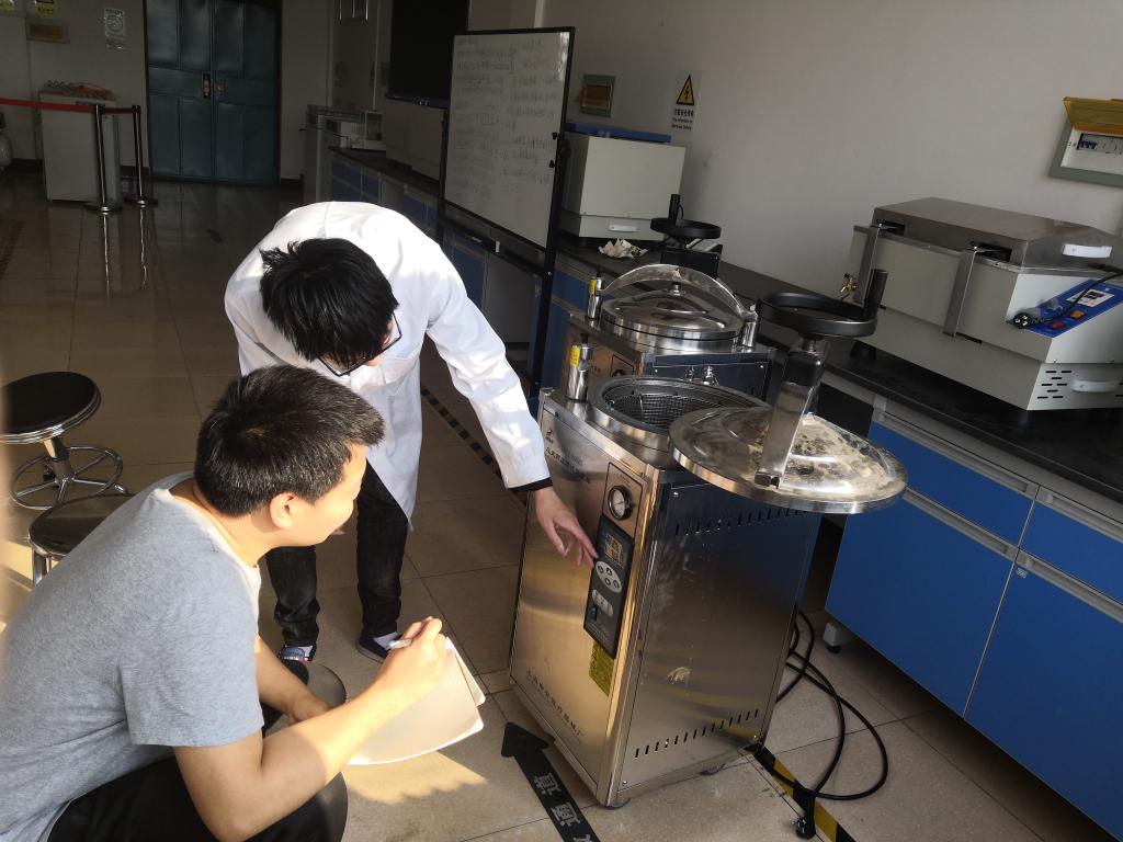 毕设开始前,石晓丹组织同学们在生物专业实验室召开毕业生安全教育活动讲座,讲解了实验室安全相关知识以及注意事项。第一阶段,讲解了一些基本仪器的规范操作。生物151班李富俊同学展示了灭菌锅的使用,他说:“虽然灭菌锅的操作不是十分复杂,但是灭菌锅在高压高温条件下工作,使灭菌锅成为实验室最重要的安全隐患,使用的同学需要时刻关注灭菌锅温度变化,如若发生问题,要立刻断电。”