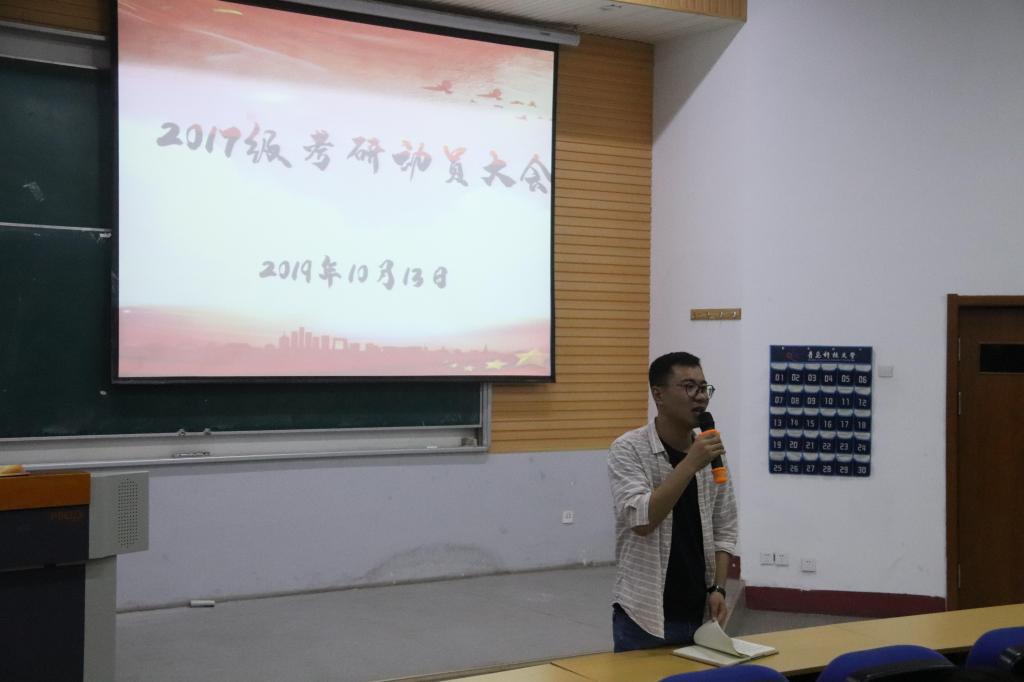 大会开始,杜宗杰老师强调了请销假制度落实问题和寝室卫生环境问题。杜老师指出:“寝室,是学习生活的重要场所,是一个学校文明程度的重要标志,是学校对外形象好坏的直观影响因素。”海洋学子应自立自强,保持宿舍整洁卫生。同时,杜宗杰老师还强调请销假制度的落实,希望同学们认真对待这件事情,以防出现假期到时间却没销假,从而被旷课情况的出现。接着,杜宗杰以近期“不忘初心、牢记使命”的活动主题引出今天的重点——考研动员。杜老师建议同学们不仅要尽早做好考研的准备,保持良好的心态,还要了解自己的兴趣爱好与能力,正确选择专业与专业课程。考研是一段艰辛的路程,外界可能会有很多的干扰,但是也要负重前行。会议最后,邀请了许东博士为同学们进行考研详细的分析。