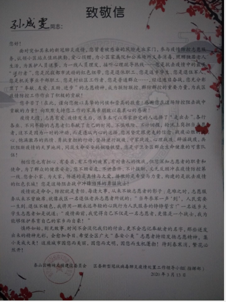 孙成雯义无反顾、慎终如始的责任担当受到当地人民和政府的一致认可,为表扬其杰出贡献,泰山区精神文明建设委员会特地为孙成雯同学送去致敬信,赞扬其充分彰显了“奉献、友爱、互助、进步”的志愿精神。