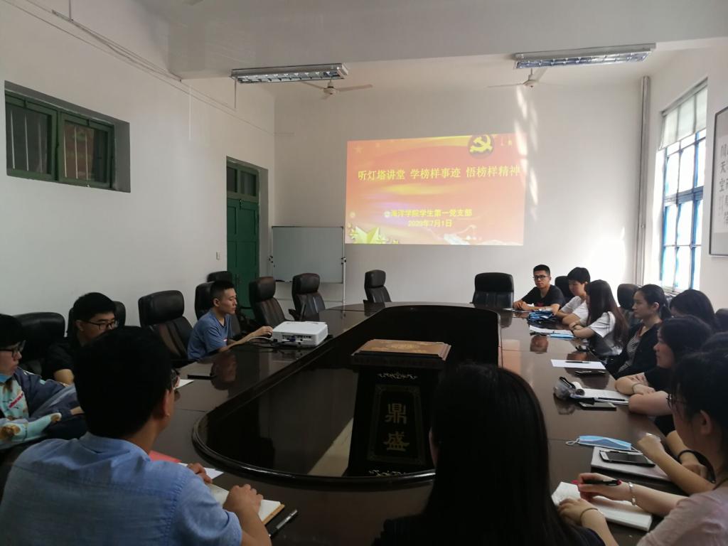 2020年7月1日,中国共产党迎来了99周岁生日。为铭记党的事迹,弘扬党的精神,海洋学院学生第一党支部于7月1日上午在一政第二会议室召开支部会议,会议主题为“听灯塔讲堂,学榜样事迹,悟榜样精神”。海洋学院学生第一党支部书记杜宗杰、副书记刘璐、副书记魏成波和其他10名党员参与本次会议。