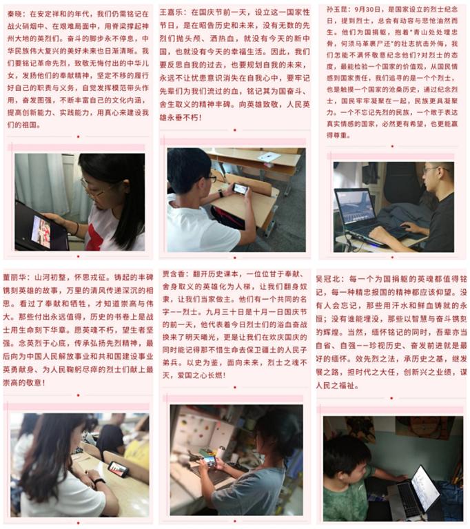 9月30日,海洋学院“红色引擎”党员工作站观看烈士纪念日向人民英雄致敬献花篮仪式直播,面对庄严的仪式与内心的铭记,他们阐释了对烈士们的缅怀和敬仰;学院组织学生通过学习强国APP,观看“时代新人说、对话战‘疫’英雄”等节目,宣讲抗疫典型的故事,引导广大学子不断增强对党和国家的情感认同和价值认同;线下宣讲“四史”知识,观看红军长征记录片,引导同学们珍惜今天来之不易的幸福生活,努力学习文化知识报效祖国。