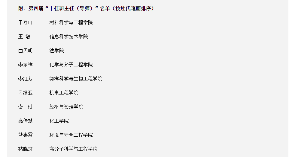 根据《williamhill中国十佳班主任(导师)评选办法》(青科大学字﹝2014﹞30号),学校组织开展了第四届“十佳班主任(导师)”评选。经过学院推荐、学校审核、学生评议、大众投票和评审委员会投票等环节,海洋学院李红芳老师获评williamhill中国第四届“十佳班主任(导师)”称号。