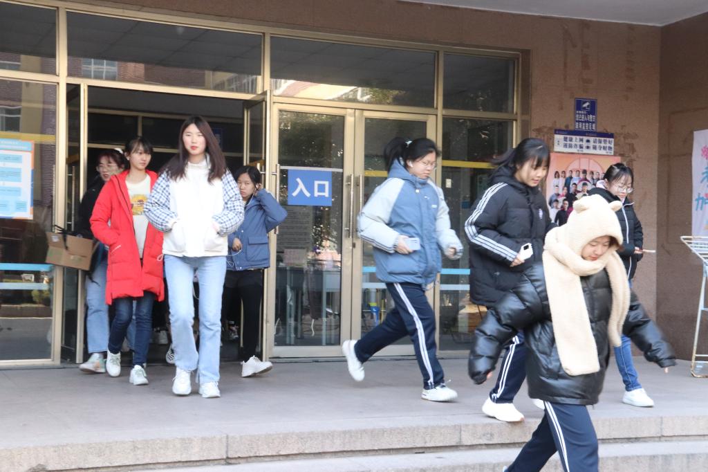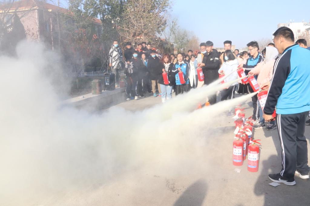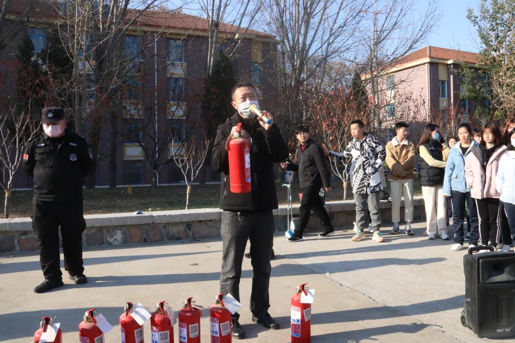 下午13:30,安全消防疏散演练正式开始,参加演练的学生在模拟着火点的烟雾中,用湿毛巾或衣袖捂住口鼻,在 疏散小组的指引下,按照疏散路线快速撤离宿舍,到达室外空旷处集合。灭火小组配合消防人员和公安处工作人员对宿舍楼内起火点扑救。集合完毕后,臧传永讲解注重消防安全的重要性。消防科负责老师随后在小五四广场为学生科普消防安全应急知识,亲自示范灭火器的使用方法,讲解火灾预防、逃生自救技能。参加演习的学生依次动手实践,多人分组完成灭火器使用的练习。