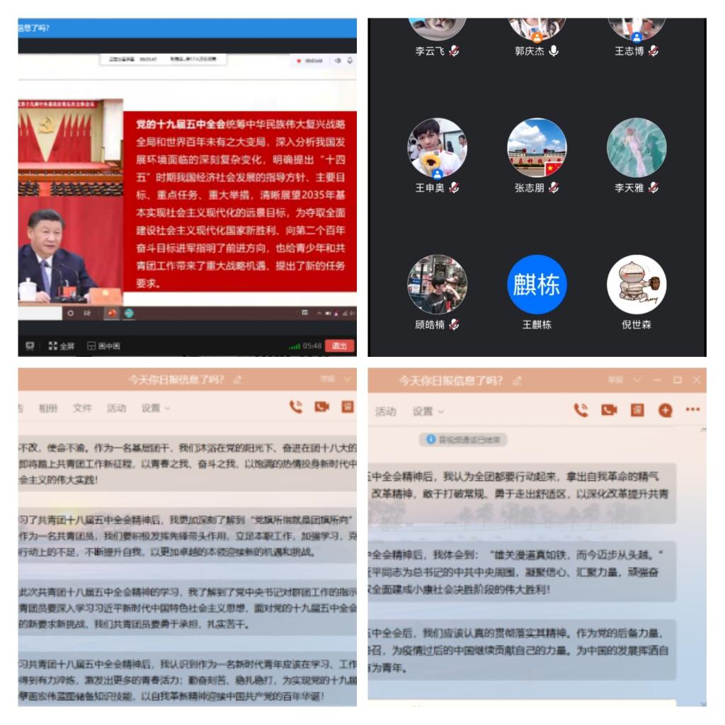 各团支部围绕“十四五”开局之年党和国家中心任务,从“总结2020年工作情况”、“部署2021年重点工作”、“新变局新要求”、“热议会议精神”等多个方面对十八届五中全会进行了简要学习。重点学习了在中华民族伟大复兴战略全局和世界百年未有之大变局的背景下,共青团和青少年面临的重大战略机遇与任务要求,新青年应担当起凝聚青年磅礴力量、服务于党和国家事业发展的使命责任,以更加坚实的脚步、更加饱满的状态、更加奋进的姿态为实现党的十九届五中全会擘画的宏伟蓝图贡献青春力量。