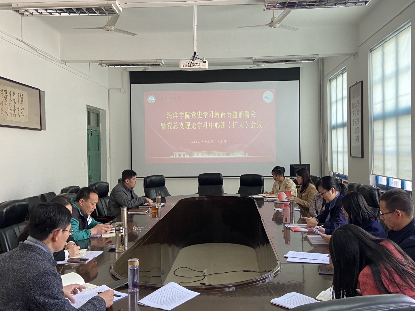 3月23日,海洋学院在一政第二会议室召开党总支理论学习中心组(扩大)会议暨党史学习教育专题部署会。会议由党总支书记周宪锋主持,全体党总支委员、各党支部书记参加会议。