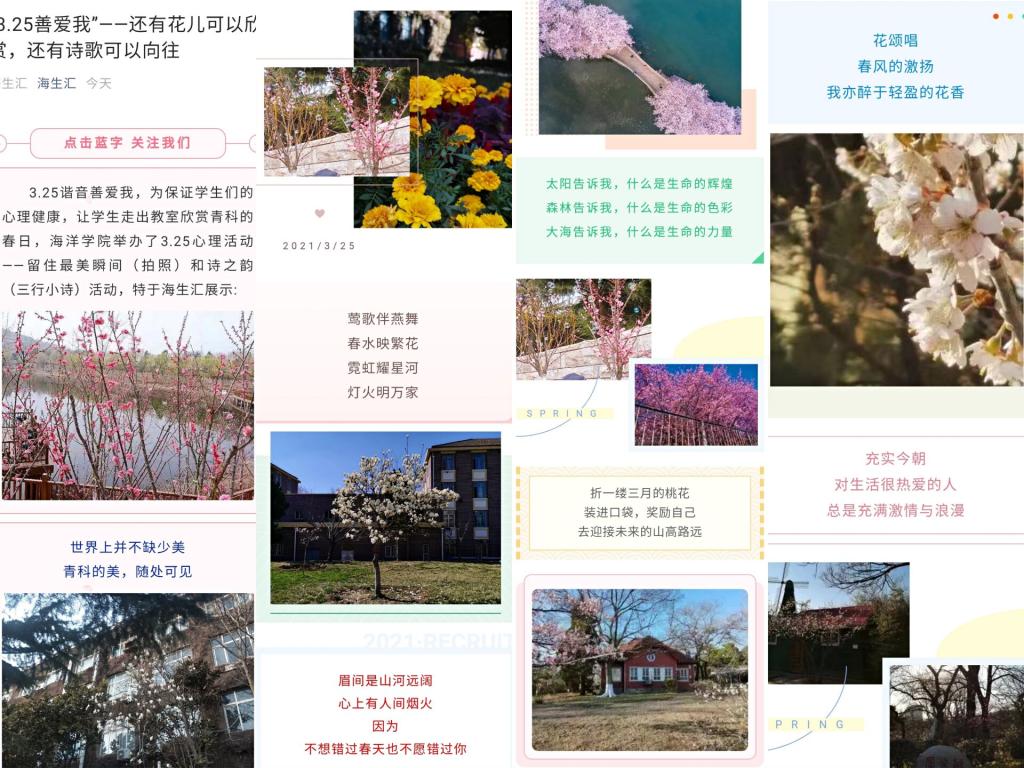 在“美”好的春天,遇见“美”好的我。阳春三月,暖意浓浓,海洋学院鼓励同学们走出宿舍,在春天的青科放飞自我,打卡青科美好的春景,同学们结伴而行,增进友谊的同时更缓解了心理压力。本活动为同学们创造了一个欣赏青科的春景,感受静谧时光的机会,引导学生关注心理健康,善爱自己、接纳他人,以更积极乐观的态度面对未来的学习和生活。
