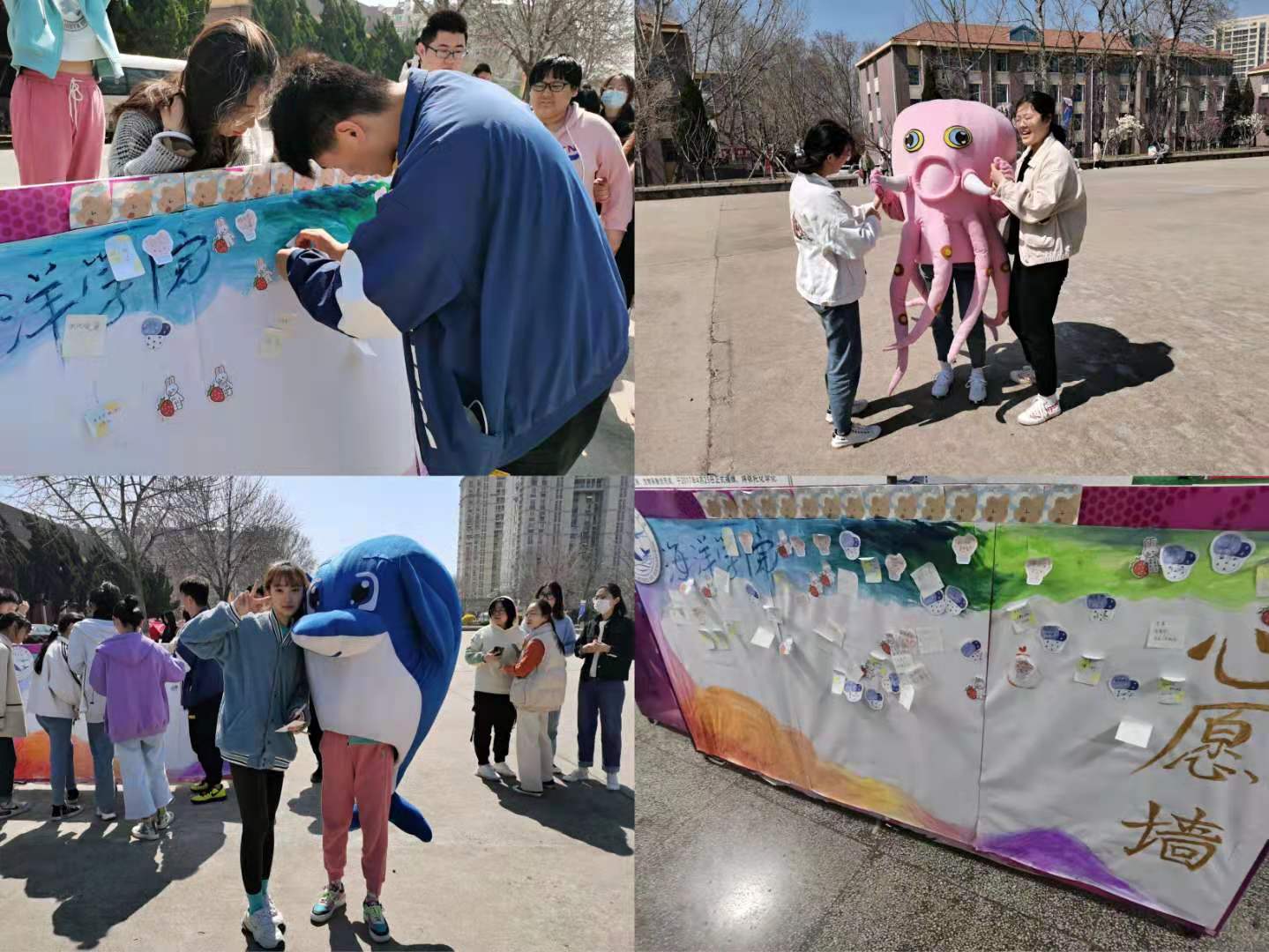 用“善”意的拥抱,相拥“善”良的我。为帮助学生缓解开学压力,以更积极饱满的姿态展开新学期的学习生活,海洋学院在3月25日,组织海洋学子着学院吉祥物服装与学院其他同学温暖相拥,击掌合影。以适当的肢体接触相互表达善意,让同学感受到海洋学院浓浓的温情。同时,海洋学院学生在小五四广场竖起“善待自己,关爱他人——心愿墙”,通过书写心愿的方式帮助同学们抒发内心真实的想法,缓解心理压力的同时传递出自己美好的祝愿。