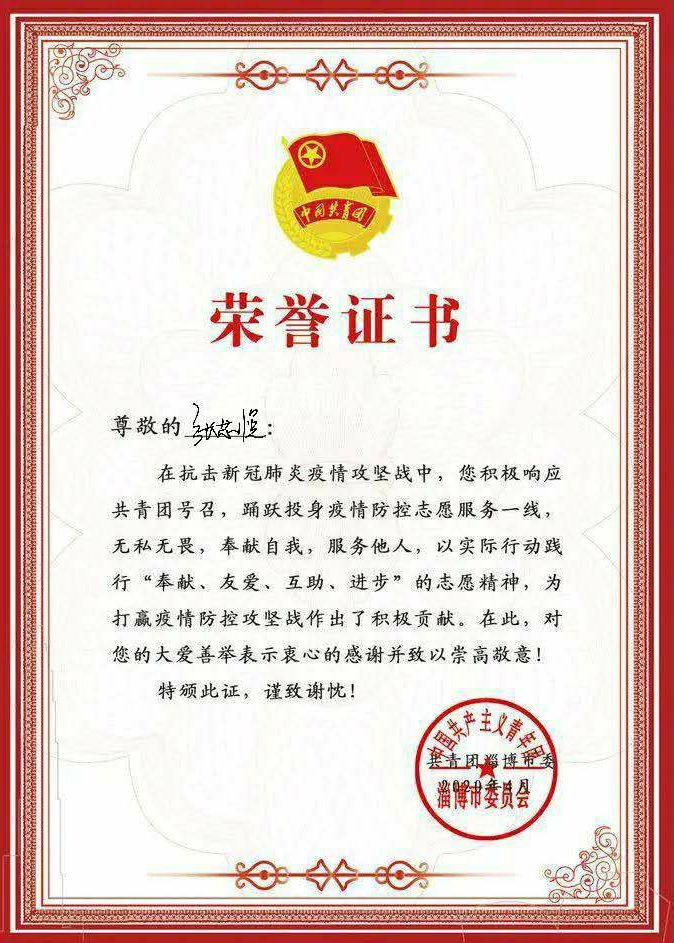 张芯悦同学假期离校返校参加淄博市防疫保障工作,与社区居委会工作人员战斗在统一战线,在四个社区间开展流动防疫工作。为进出社区的人员测量体温,与工作人员一同发放口罩和消毒液,帮助设计社区防疫宣传标语和海报,电话联系社区发热人员和淄博市中心医院进行隔离防治,志愿工作期间认真负责,社区居委会及淄博市委员会给予了充分的肯定。