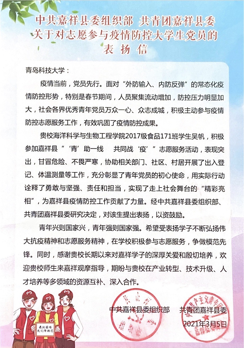 近日,海院食品171班吴帆和海科192班曲浩、张芯悦、张若佳、仲康宁收到表扬信,信中对我院学子提出表扬。