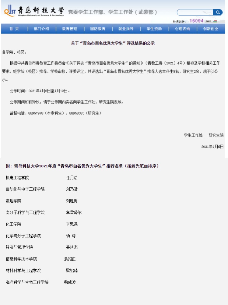 根据中共青岛市委教育工作委员会《关于评选“青岛市百名优秀大学生”的通知》(青教工委〔2021〕4号)精神及学校相关工作要求,经学院(校区)推荐、学校审核、评委评定,共评选出“青岛市百名优秀大学生”推荐人选本科生8名,研究生2名,海洋学院魏成波成功入选。