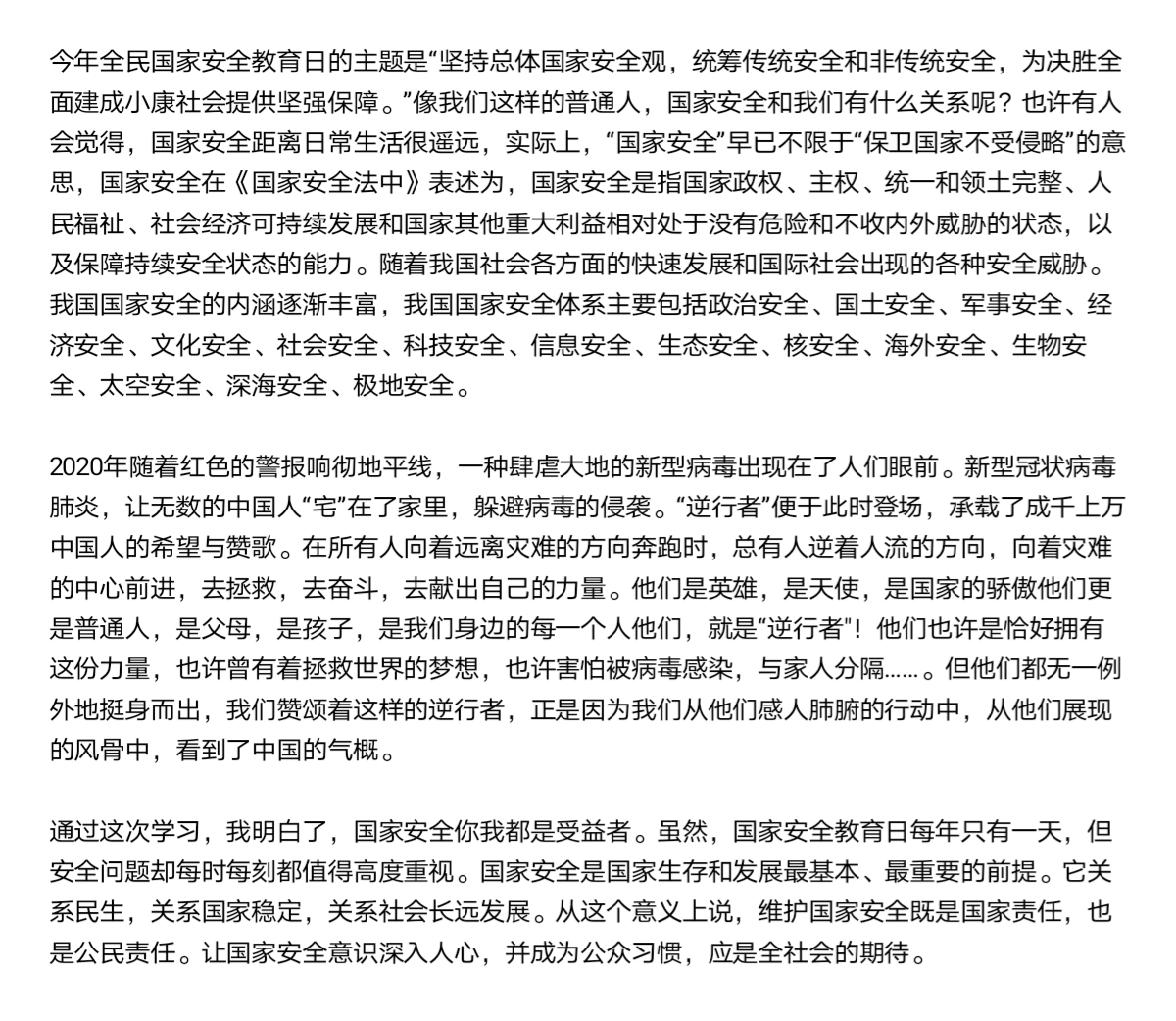 为进一步推动海洋学院国家安全教育工作深入开展,学院举办主题为“践行坚持总体国家安全观,统筹发展和安全,统筹传统安全和非传统安全,营造庆祝建党100周年良好氛围”的征文活动。