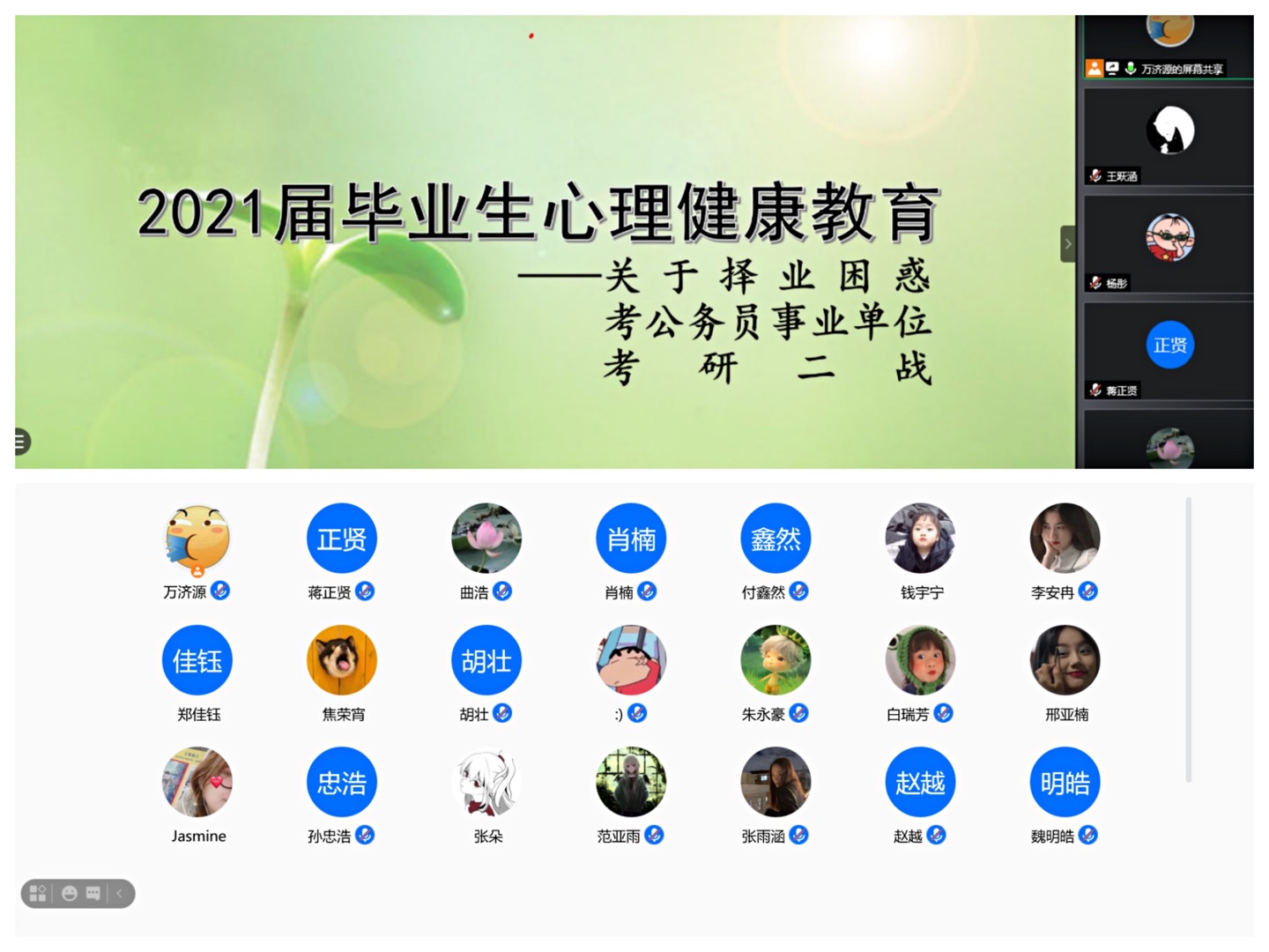视频连线诉困惑,真情实意解疑难。为帮助大一、大二同学缓解日常学习压力,寻找学习工作的平衡点,找到适合自己的奋斗目标和发展方向,海洋学院组织“说出你的心声”视频连线活动。同学们通过线上交流的方式表达心中所思所感,提出日常学习、生活和工作中的困惑,得到无条件的接纳和全心全意的倾听,高年级的学长学姐就同学所提问题给出了针对性的建议以及鼓励和支持,分享自己的学习经验和生活经历,帮助同学们提高学习动力,加强自我管理能力。