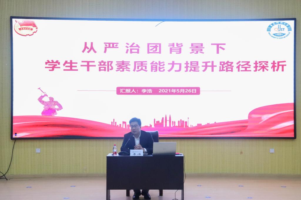 会议上,李浩首先传达了校党委书记马连湘在学校青年学生党史学习教育思政示范课的精神。并围绕团学干部作风整顿提升对全体学生干部以《从严治团背景下学生干部素质能力提升路径探析》为题讲授专题团课,从“从严治团对学生干部提出更高的能力和要求”以及“怎么样提升学生干部能力和素质”与同学们进行了深入的探究,提出必须大力抓严团的干部队伍建设。同时,李浩还指出,身为学生干部要明确角色定位,解决好“角色冲突”和“本领恐慌”的两方面的矛盾,并从“政治站位”、“能力素质”、“理念方法”和“作风状态”四个方面对学生干部整顿提升提出“坚定理想信念、心系广大青年、提高工作能力、锤炼优良作风”的要求,指导学生干部在工作上要做到汇报工作说结果、请示工作说方案、总结工作说流程、布置工作说标准、关心下级问过程、交接工作讲道德、回忆工作说感受,不断提升七种能力,做到学习、实践、提高、奋斗,不断提升学生干部的能力和素质。