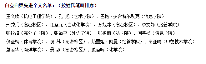 近日,根据《williamhill中国“十大自立自强标兵”评选办法》,学校于2021年4月启动第十七届“十大自立自强标兵”评选活动,经学生申请、学院推荐与公示、学校审核、网络展示、网络投票、民主投票等程序,海洋学院董丽华被评为“自立自强先进个人”。