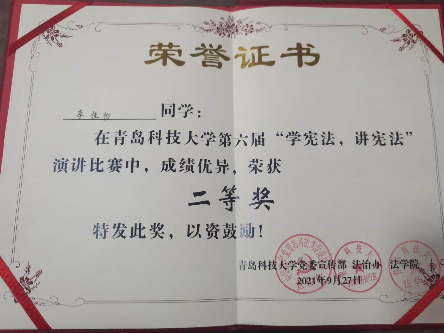 来自各学院选拔推荐的十七位参赛选手,围绕“宪法”主题,讲述宪法与国家、社会、个人之间的密切关系,结合时下热点话题、典型案例,积极传递法治力量和温度。演讲过程中,选手们情感饱满,语调铿锵,充分展现了当代大学生自信从容的青春风采。经过激烈角逐,海洋学院的李佳怡荣获二等奖。