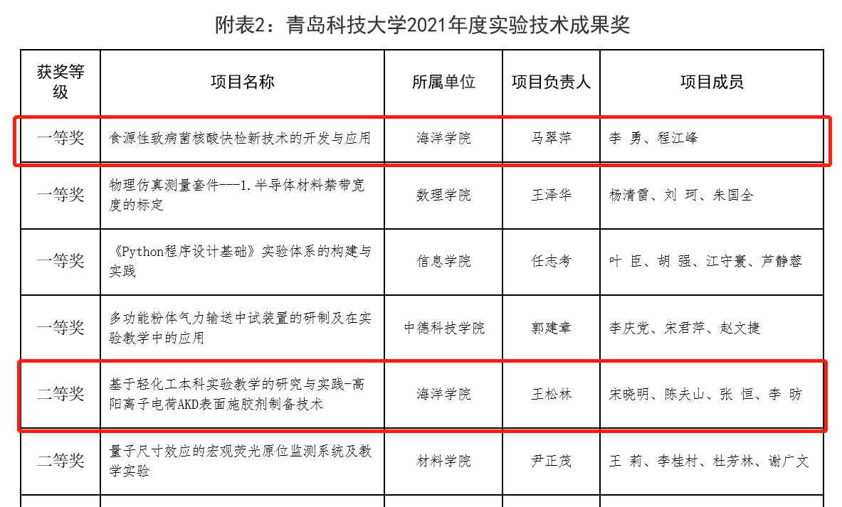 近日,学校公示了williamhill中国2021年度实验教学改革奖及实验技术成果奖评选结果公示评选结果,其中,海洋学院马翠萍院长负责的项目《食源性致病菌核酸快检新技术的开发与应用》获评实验技术成果奖一等奖,王松林老师负责的项目《基于轻化工本科实验教学的研究与实践-高阳离子电荷AKD表面施胶剂制备技术》获评实验技术成果奖二等奖。