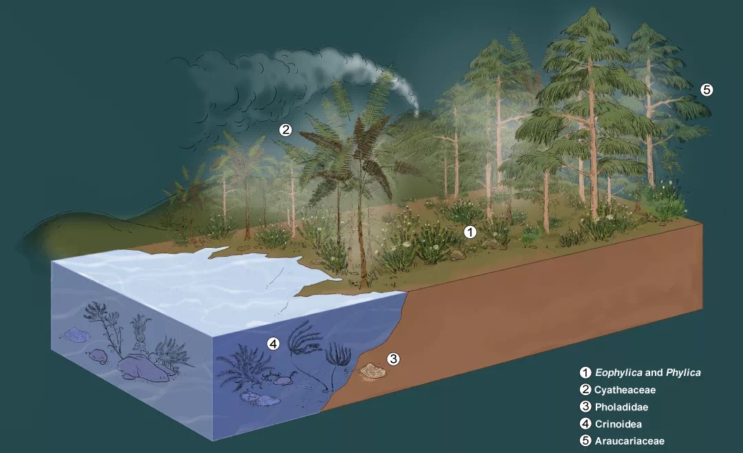 图三:琥珀化石形成时期生态复原图,图中地表低矮植物为Phylica