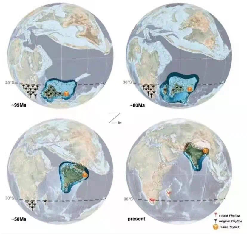 图二:Phylica祖先随印度板块向北漂移的过程重建图