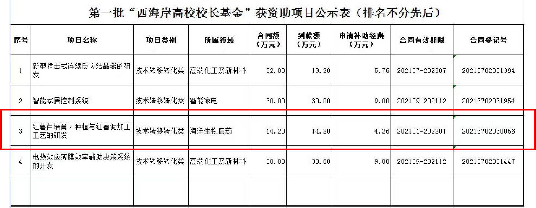 据悉,自《关于组织申请2021年度“西海岸新区高校校长基金”后补助项目的通知》发布以来,共收到申报项目5项。经过资格审查、评审小组评审,确定第一批“西海岸新区高校校长基金”后补助资助项目4项。