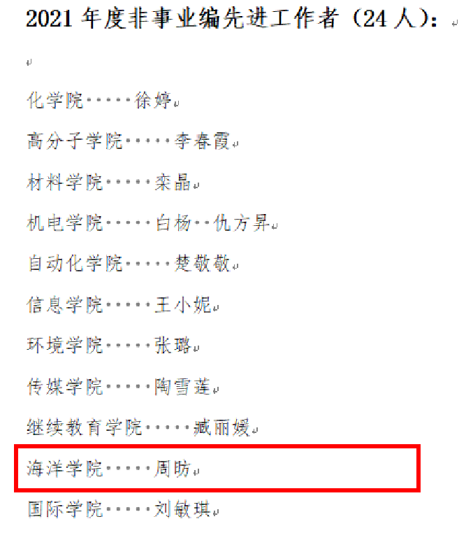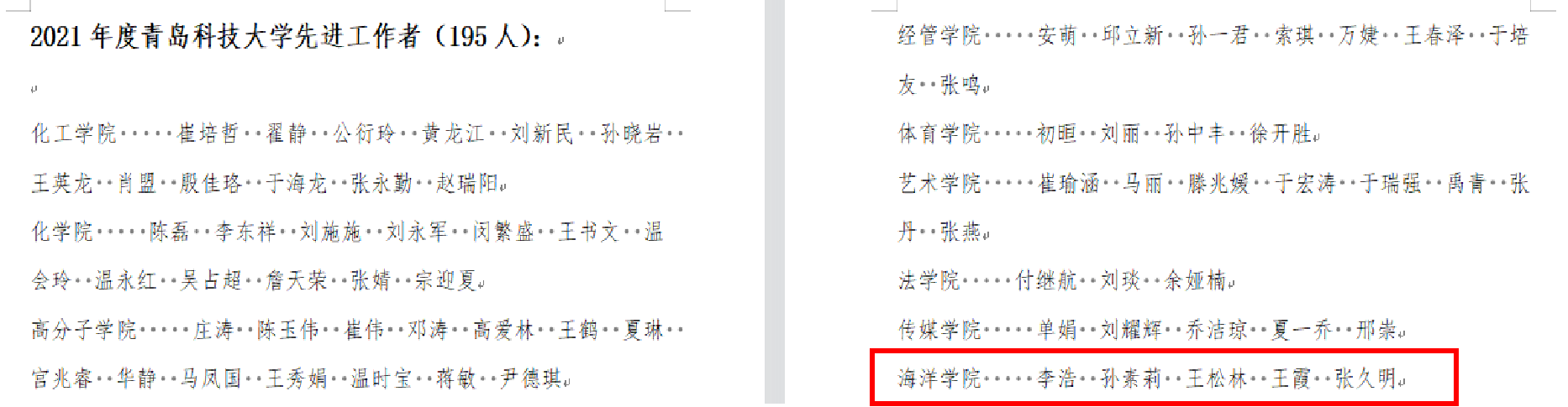海洋学院解万翠教授荣获“三八红旗手”,实验中心荣获“教育先锋号”;实验中心、食品质量与安全教研室荣获“先进集体”,王松林、王霞、张久明、孙素莉、李浩、周昉荣获“先进工作者”;李昉荣获“先进女职工”,张慧、王秀丹、杨芳、李红芳荣获“工会先进工作者”。