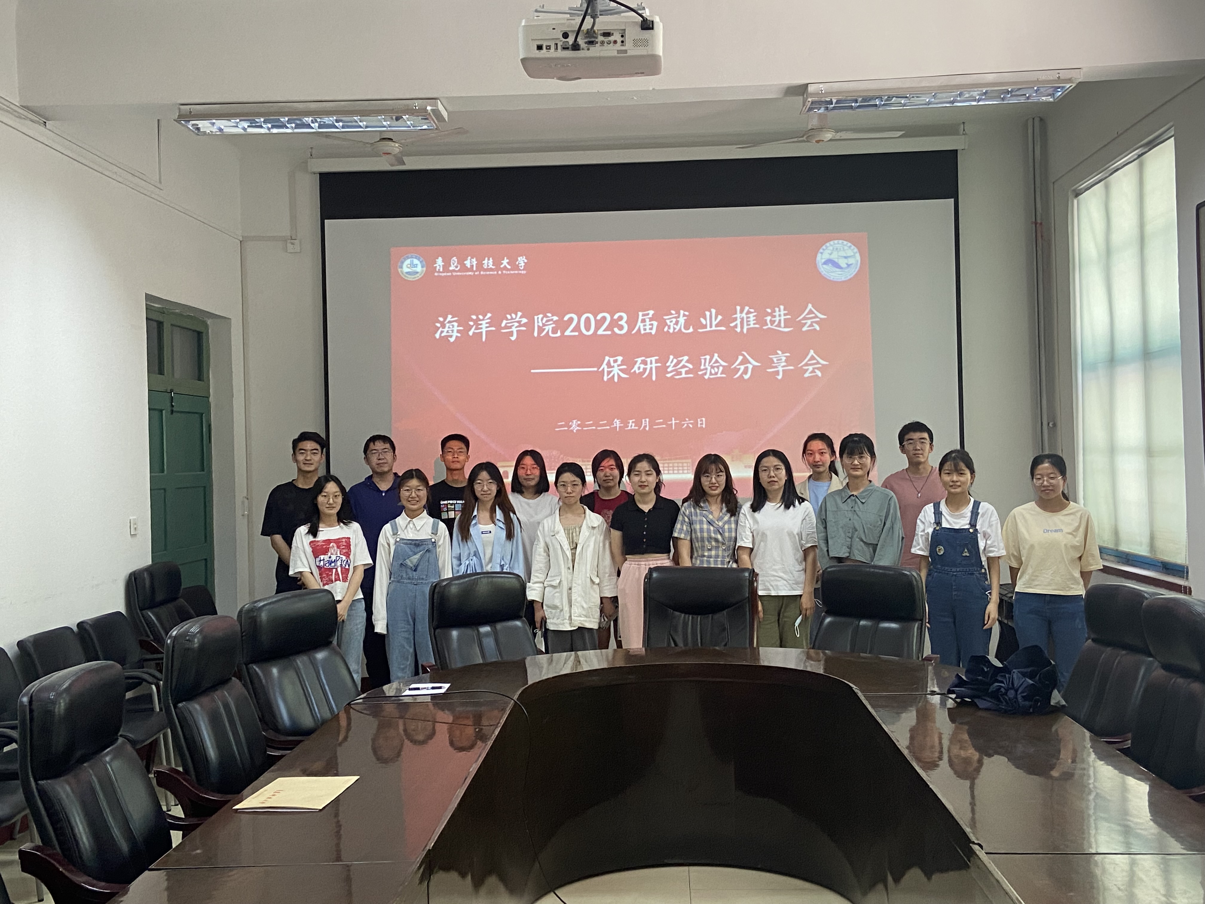 为扎实做好2023届毕业生就业工作,海洋学院召开2023届就业推进会暨保研经验分享会,2022届推免生董丽华(推免至中国海洋大学)、王艺历(推免至中科院化学所)、武咪(推免至天津大学)作经验分享。会议由辅导员李浩老师主持,2019级部分学生参会交流。
