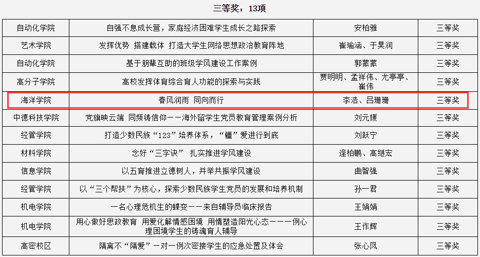 海洋学院辅导员李浩、吕珊珊的案例《春风润雨同向而行》从全校41个案例中脱颖而出,荣获学校三等奖。