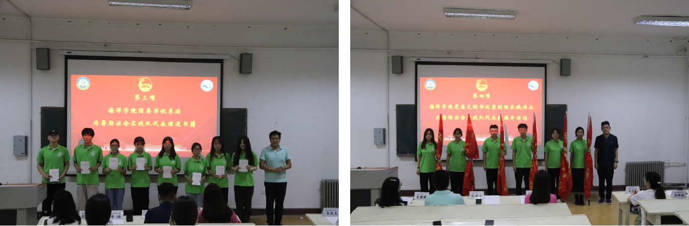 仪式上,李浩为社会实践重点队伍代表赠送《在庆祝中国共产主义青年团成立100周年大会上的讲话》(单行本)。2021级辅导员吕珊珊宣读了《2022年大学生志愿者暑期文化科技卫生“三下乡”社会实践活动的通知》,2020级辅导员刘金岭宣读《海洋学院校级重点团队名单》。