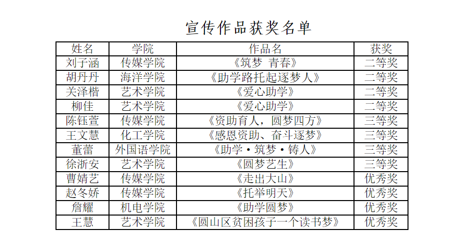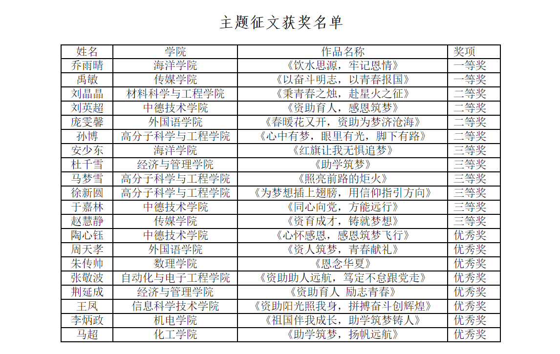 根据学校《关于开展2022年学生资助育人系列主题活动的通知》要求,海洋学院积极组织,号召学生参与活动。经学院(校区)推荐、资格审核、学校评审,海洋学院生物212乔雨晴荣获主题征文一等奖 ,生物212安少东荣获主题征文三等奖 ,生物212胡丹丹荣获宣传作品二等奖。