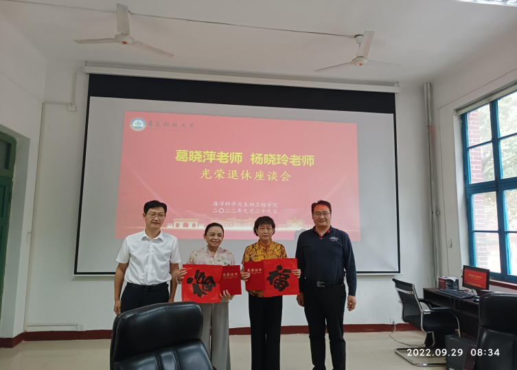 9月29日上午,海洋学院举办葛晓萍、杨晓玲同志光荣退休座谈会。学校人事处副处长雷剑、学院班子成员、师生代表参加。院工会主席李高宁主持。