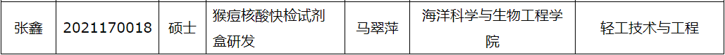 近日,学校对2022-2023学年研究生自主科研创新项目评选结果进行公示,海洋学院由马翠萍教授指导,张鑫硕士主持的《猴痘核酸快检试剂盒研发》获批2022-2023学年研究生自主科研创新项目。