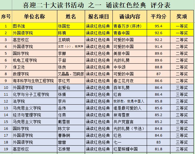 各学院各部门各校区教职工们踊跃参与,朗诵选手们紧扣主题,用真挚的情感、生动的语言、饱满的热情,诵读了《青春万岁》《红岩》《红色》等红色作品,带领我们回顾革命艰辛、感受峥嵘岁月、坚定初心使命,从党史学习教育中汲取奋进力量。经过多位评委的公平公正公开的评比,海洋学院李红芳朗诵的《春江花月夜》荣获二等奖。