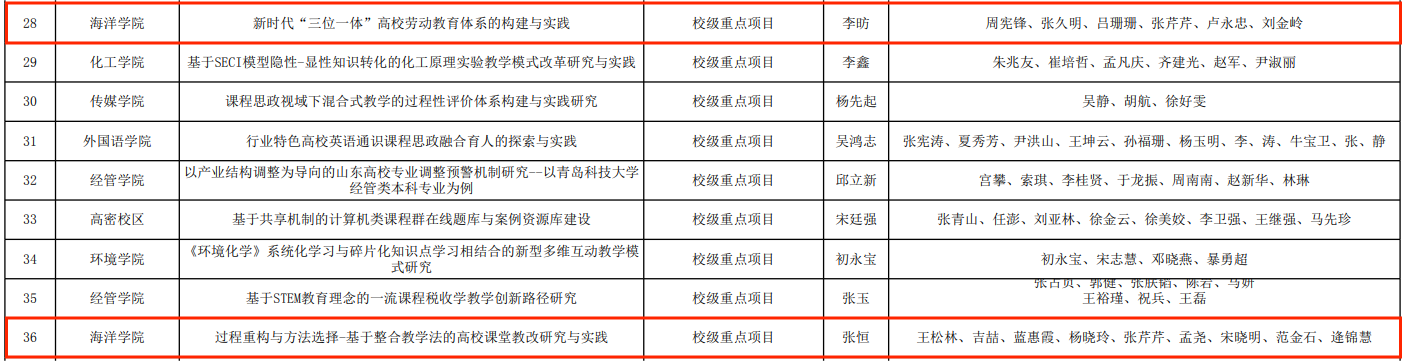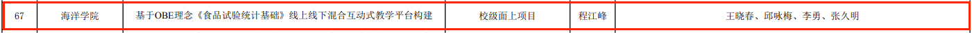 其中,王新萍主持的项目《海洋科学专业融入经略海洋新发展格局特色能力体系构建研究》、李昉主持的项目《新时代“三位一体”高校劳动教育体系的构建与实践》、张恒主持的项目《过程重构与方法选择-基于整合教学法的高校课堂教改研究与实践》获校级重点项目立项;程江峰主持的项目《基于OBE理念《食品试验统计基础》线上线下混合互动式教学平台构建》获校级面上立项;魏曼曼主持的项目《新工科背景下融合OBE理念的“生物化学”教学模式的改革与创新》获新工科新文科建设研究专项立项;李浩主持的项目《基于“三维四阶”、“多员协同”的专创融合教学改革探索与实践》获专创融合研究专项立项。