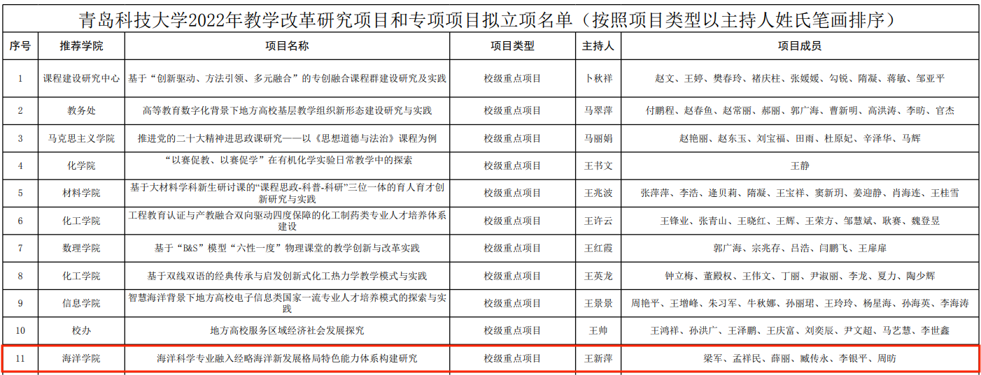 根据《山东省教育厅关于做好2022年本科教学改革研究项目立项申报和管理工作的通知》和学校2022年校级教学研究项目及立项项目申报通知相关要求,学校近期开展了校级项目申报和省级项目遴选推荐工作。经个人申报,学院推荐,校外专家评审,校本科教学工作委员会审议,海洋学院共六个项目获批2022年校级教学研究项目及专项项目立项。
