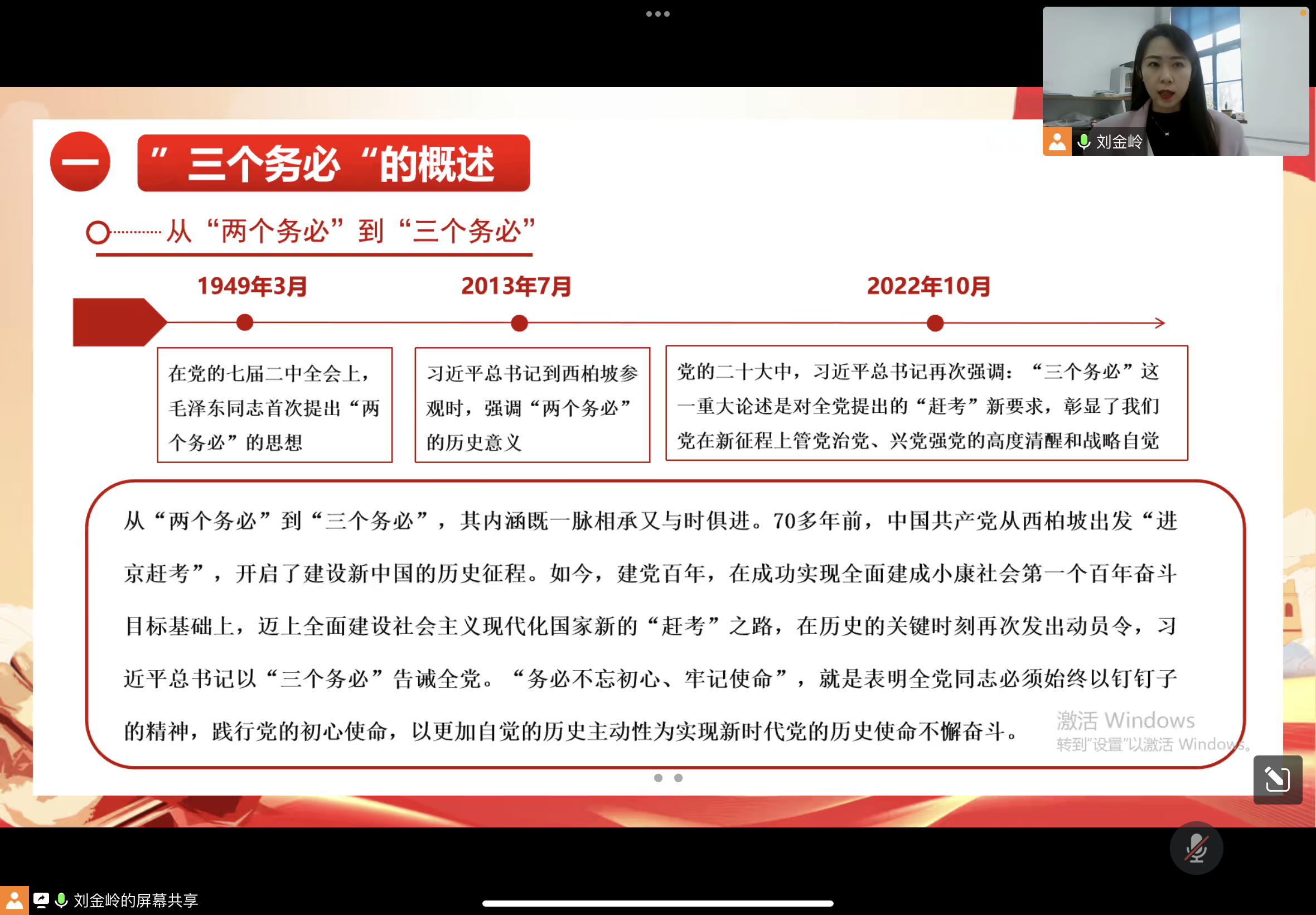刘金岭对党的二十大中提出的牢记“三个务必”进行了详细的解读,“三个务必”是习近平总书记立足新时代世情国情党情的变化进行深刻分析作出的重大论断。此次党课从“三个务必”的概述、重要意义、科学内涵和自觉行动四个方面展开。她指出“三个务必”,是我们党从百年奋斗特别是新时代十年完成“三件大事”、赢得“三大历史性胜利”的伟大实践中得出的历史经验,是我们党自信自强、守正创新,踔厉奋发、勇毅前行、不断从胜利走向胜利的智慧结晶,是我们党不断推进自我革命,始终成为中国特色社会主义事业的坚强领导核心的根本保障。