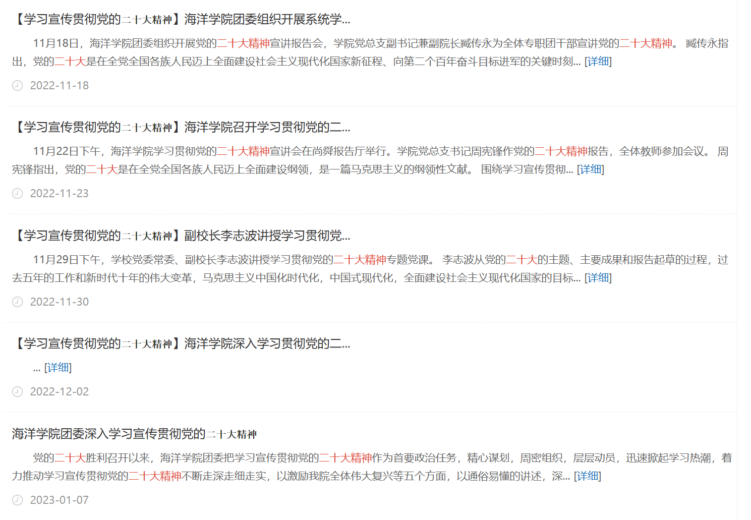 海洋学院团委深入学习贯彻习近平新时代中国特色社会主义思想和党的二十大精神,深入学习习近平总书记在庆祝建团一百周年大会上的重要讲话精神和《论党的青年工作》,用好《习近平与大学生朋友们》一书。学院党总支书记周宪锋、团委书记李浩、专职团干刘金岭等专职团干带头宣讲党的二十大精神,引导全院党员及学生干部切实把思想和行动统一到党的二十大精神上来,让学习宣讲真正入脑入心,在全院上下营造浓厚的学习宣传党的二十大精神氛围。