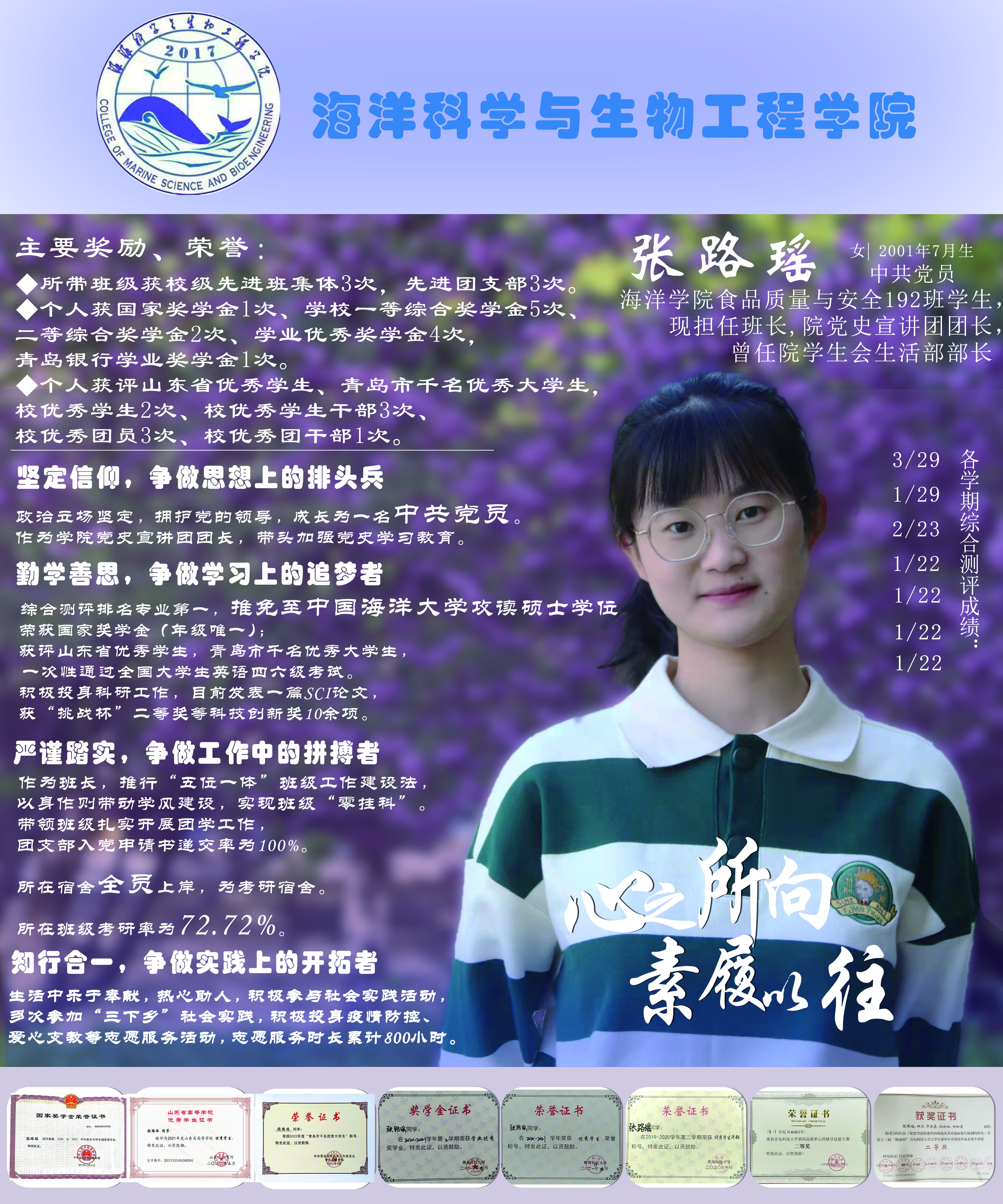 张路瑶,女,2001年7月生,中共党员,海洋学院食品质量与安全192班学生,现担任班长。各学期综合测评成绩:3/29、1/29、2/23、1/22、1/22、1/22、1/22。