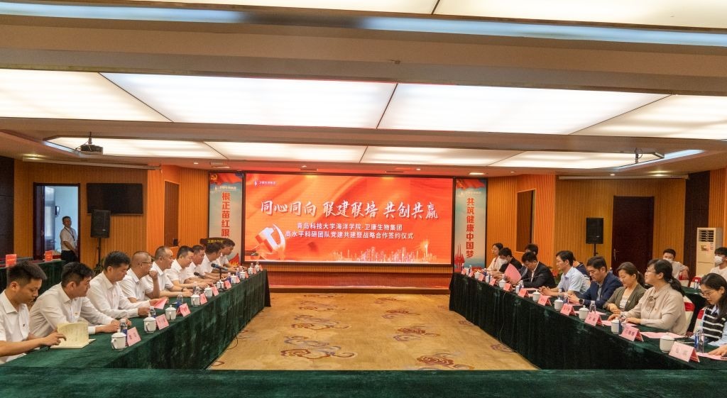 为持续推动学习贯彻习近平新时代中国特色社会主义思想主题教育走深走实、见行见效,围绕开展社会服务调研,进一步推进有组织科研,加强科研团队建设,5月19日,海洋学院和卫康生物集团“同心同向,联建联培,共创共赢”高水平科研团队党建共建合作签约仪式在卫康生物科技园举行。卫康集团董事长王宗继,党委书记王玉平,副书记杜广青,海洋学院党总支书记周宪锋,党总支副书记兼副院长臧传永,海洋生物健康食品科研团队党支部书记解万翠等双方所属党员代表参加此次活动。活动由杜广青主持。