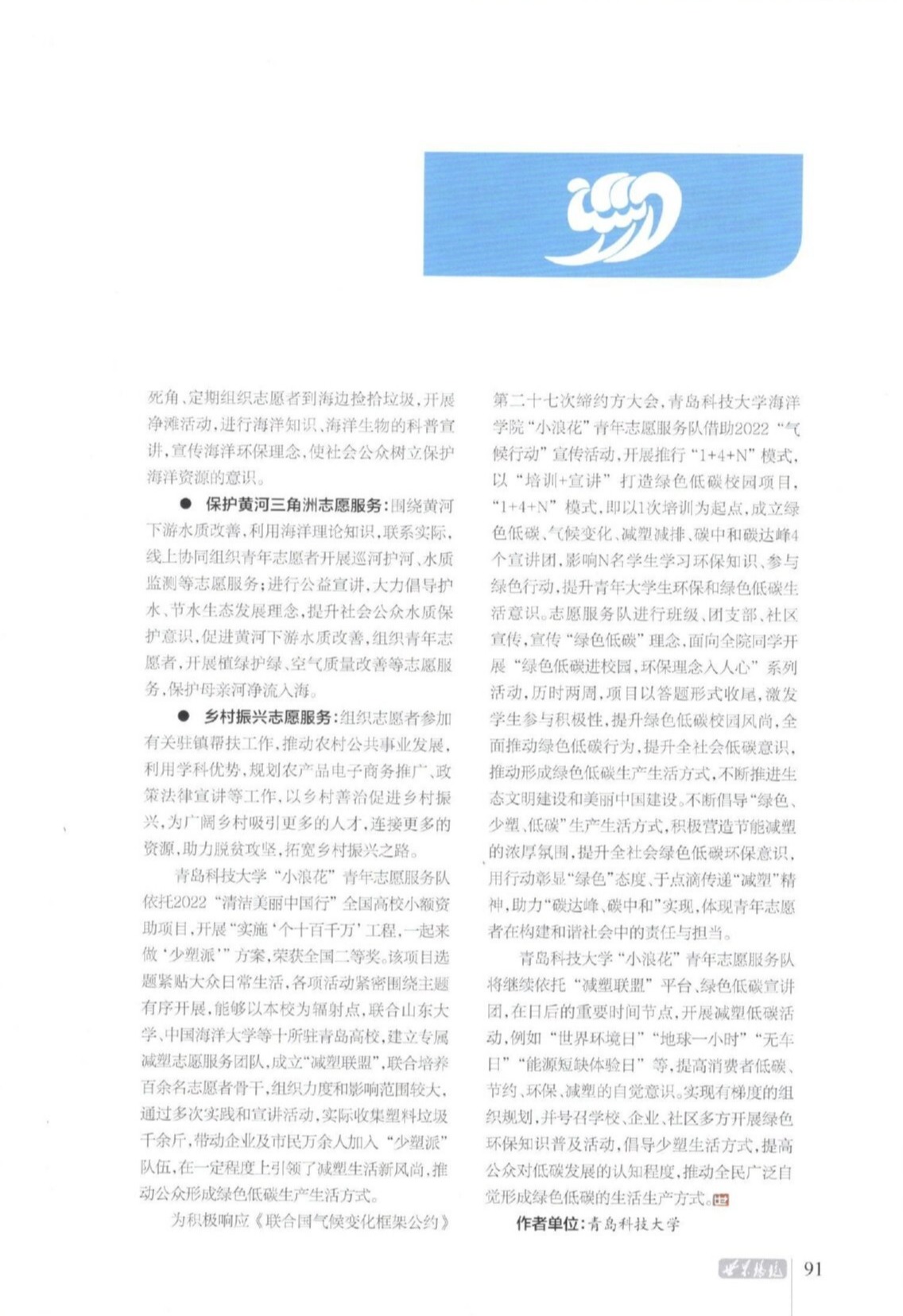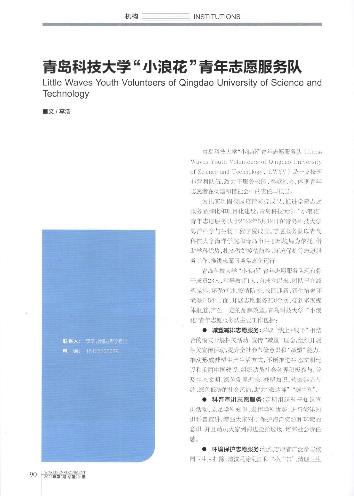 近期,《世界环境》杂志专题报道海洋学院“小浪花”青年志愿服务队。