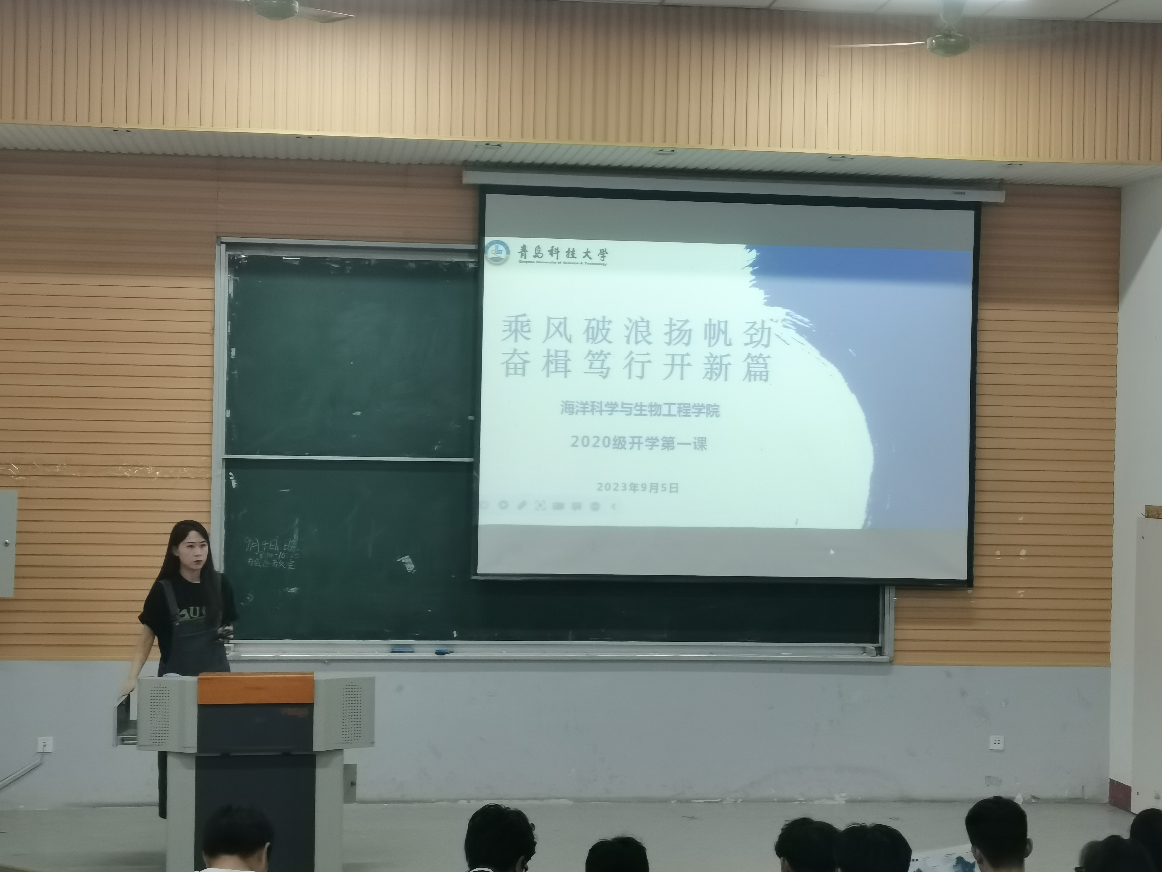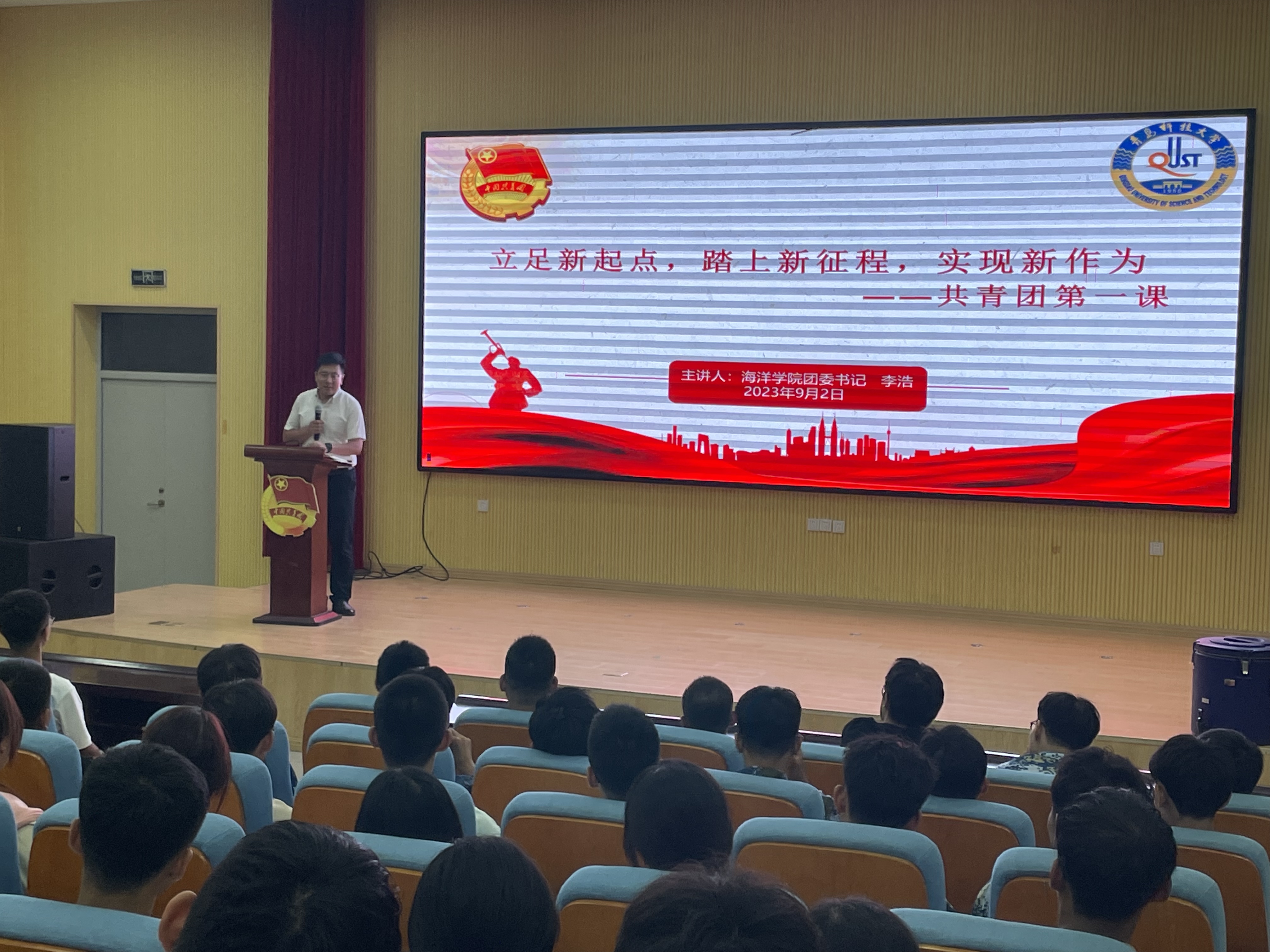 海洋学院学工办主任兼团委书记李浩及新生辅导员郭颖结合开学第一课,开展“立足新起点,踏上新征程,实现新作为”共青团第一课,以提高新生团员青年的思想觉悟,强化团员的先进性和光荣感,分享学院青年学子们勇担使命的青春风采,不断增强同学们对中国特色社会主义的理论认同、政治认同、情感认同,号召学生努力做有理想、敢担当、能吃苦、肯奋斗的新时代好青年。