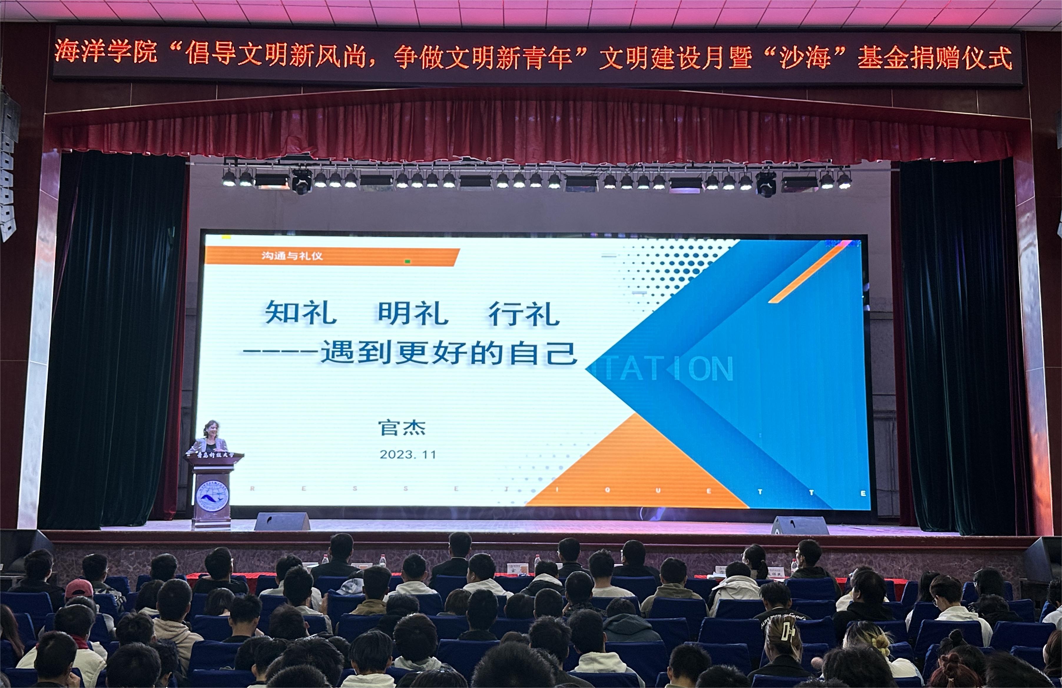 为深入开展校园文明建设,11月7日下午,海洋学院举行“倡导文明新风尚,争做文明新青年”文明建设月启动仪式暨“沙海”基金捐赠仪式。学校妇委会主任、数据科学学院党总支书记官杰,学生处副处长宋飞,校团委副书记李航,海洋学院班子成员周宪锋、李昉、臧传永,院长助理孟祥民,学院全体学生及教师代表参加活动。