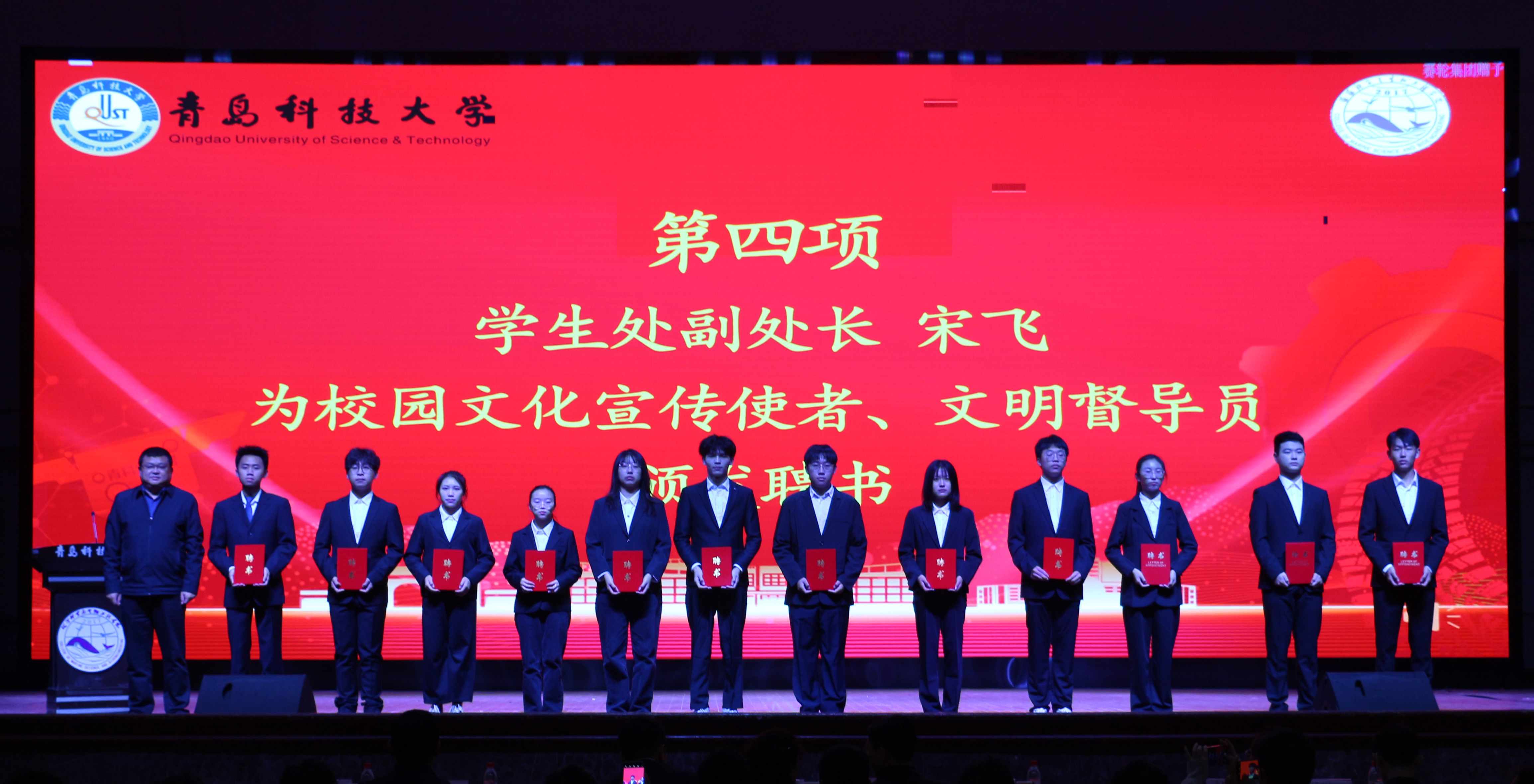 孟祥民宣读了学院校园文化宣传使者、文明督导员名单,宋飞为他们颁发聘书。