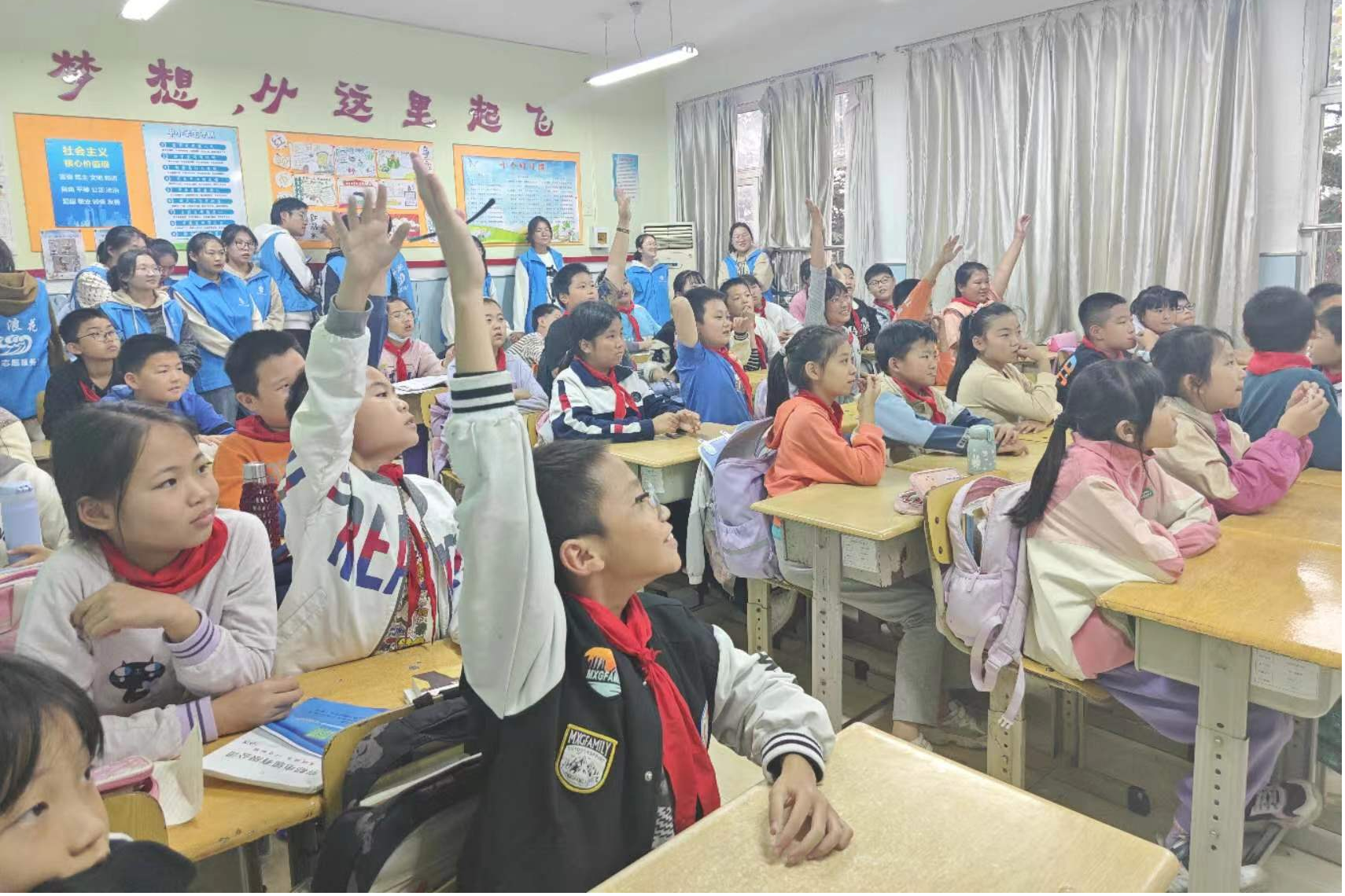 志愿者向小学生们深入浅出地讲述了环保与人类生存发展的关系以及“减塑”重要性等,学生们聚精会神地听课,深入地了解了绿色低碳的相关知识。随后,志愿者通过与小学生们互相分享生活中的低碳案例,学生们踊跃发言,现场气氛热烈,绿色低碳知识在互相分享中根植于孩子们的心灵深处。