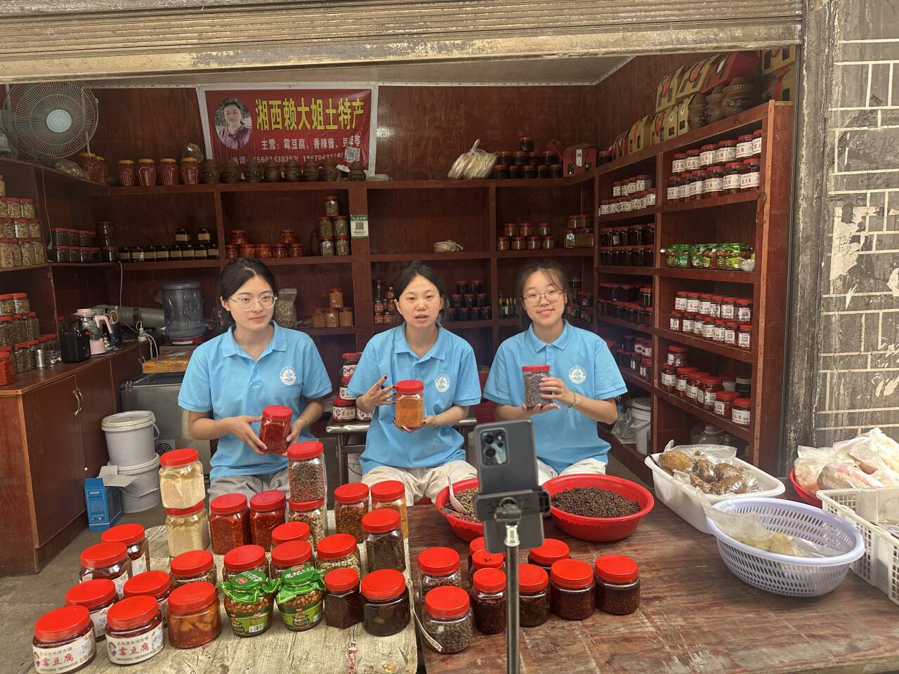 7月27日,实践团成员总结直播经验,在洗车河镇洗车社区霉豆腐销售点进行直播技巧的培训与推广,帮助销售点实现线上销售从“他助”到“自助”的转变。