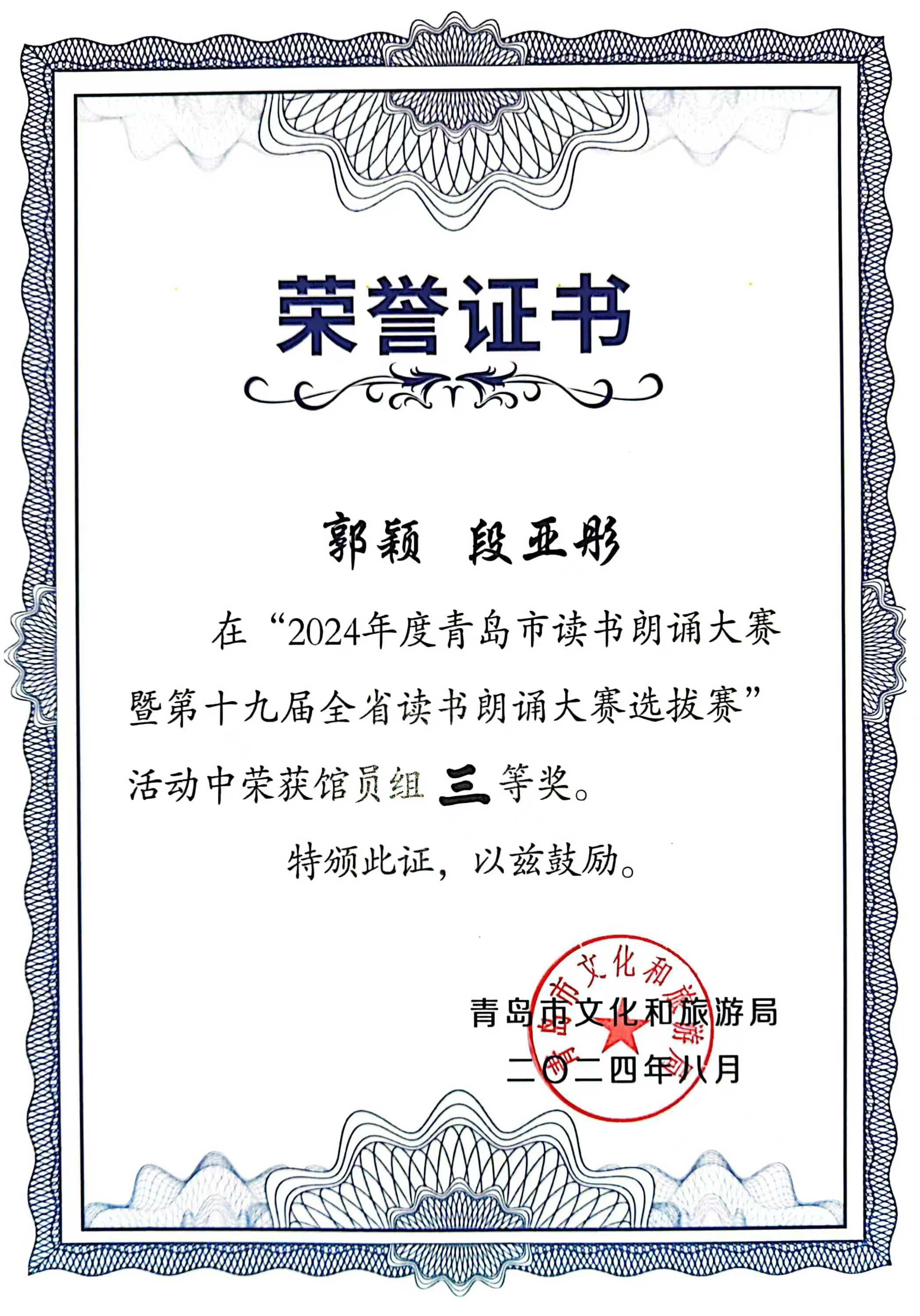 8月22日,青岛市成功举办2024年度青岛市读书朗诵大赛暨第十九届全省读书朗诵大赛选拔赛馆员组比赛,大赛由青岛市文化和旅游局主办,各区(市)文化和旅游局、青岛市图书馆承办,各区(市)图书馆联合协办。我院教师郭颖、海洋231班学生段亚彤共同创作的作品《离书最近的人》荣获青岛市三等奖。